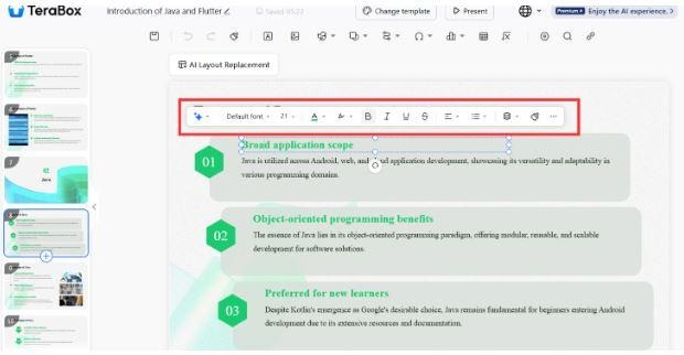 In a few seconds, TeraBox will present a detailed yet concise series of slides in front of you. Review it. You can add personalization through features like font color change and size change. If needed, add images to enhance the overall engagement.