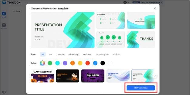 TeraBox AI allows you to choose the theme and basic aesthetic design of your presentation. It has a wide variety of options to choose from. Explore and click on the presentation theme that suits you the best. Click on “Start Generating”.